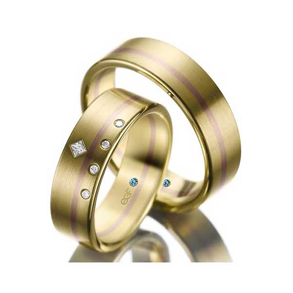 Geelgouden trouwringen met roodgouden band. In damesmodel 4 diamanten van 0.01 ct in briljantslijpsel en één van 0.03 ct in Princess slijpsel.
