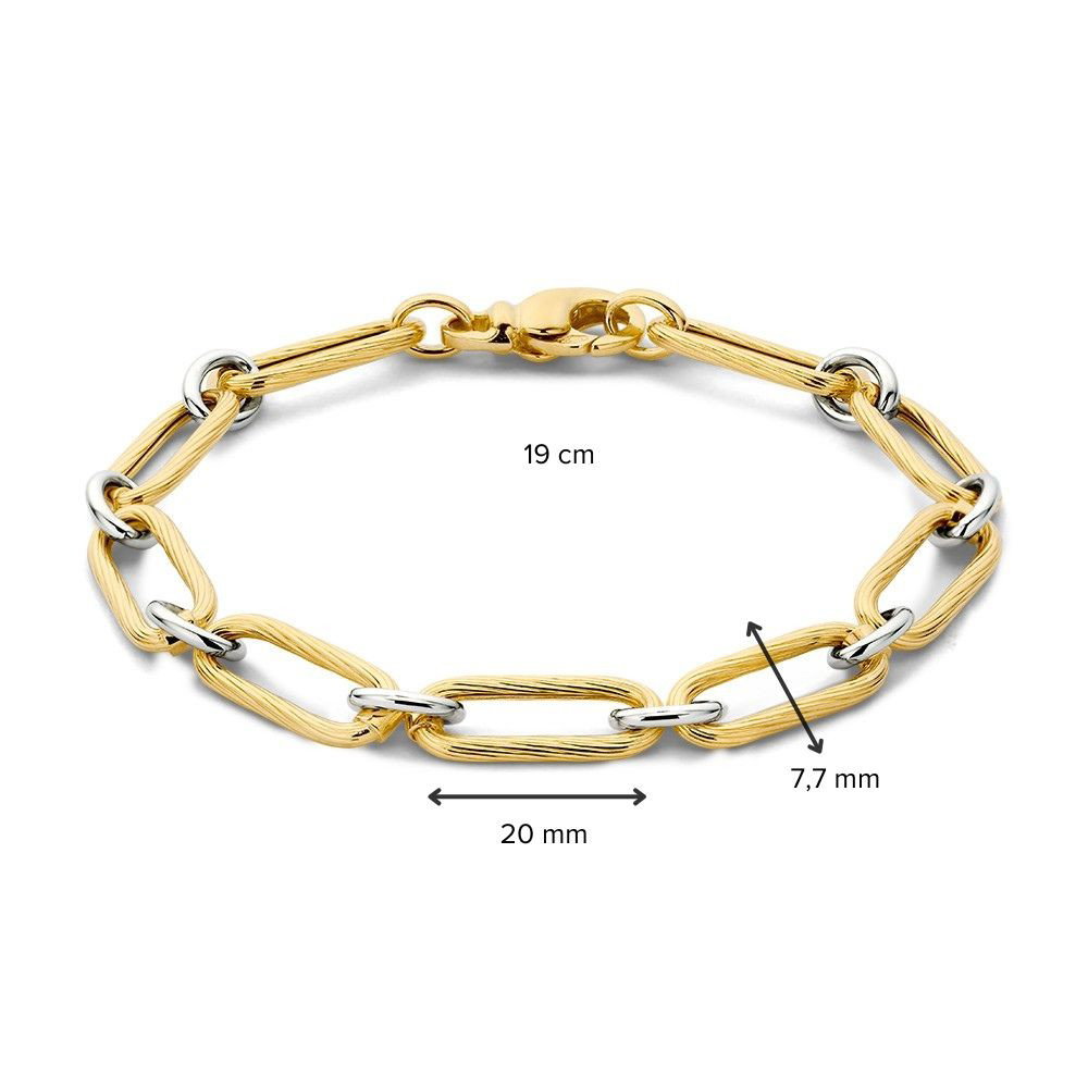 Bicolor wit- en geelgouden armband met grote schakels. De geelgouden schakels hebben een verfijnde bewerking.