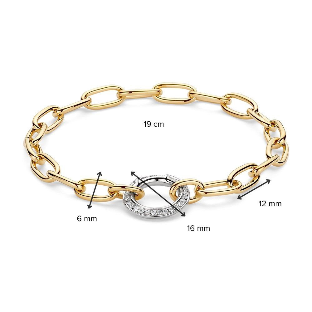 Stijlvolle geelgouden schakelarmband met een opvallend witgouden veerslot gezet met diamanten.