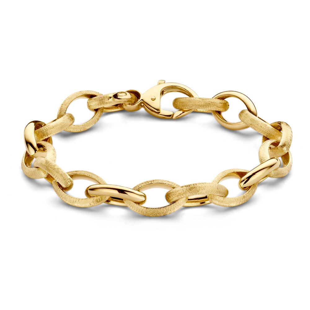 Stijlvolle geelgouden armband met ovale schakels. De schakels deels glanzend afgewerkt en deels gematteerd, een prachtig effect!