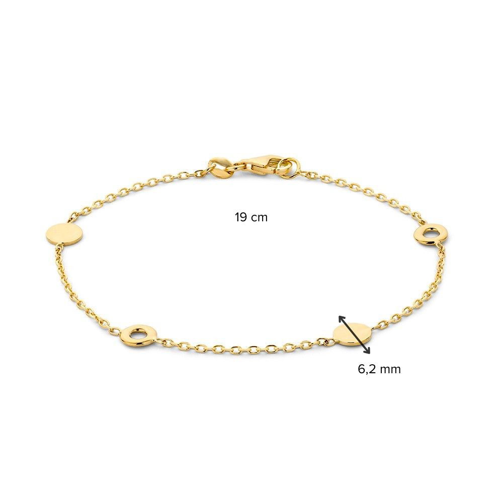 Verfijnde geelgouden armband met twee open cirkels en twee gouden plaatjes die eventueel voorzien kunnen worden van een gravure.