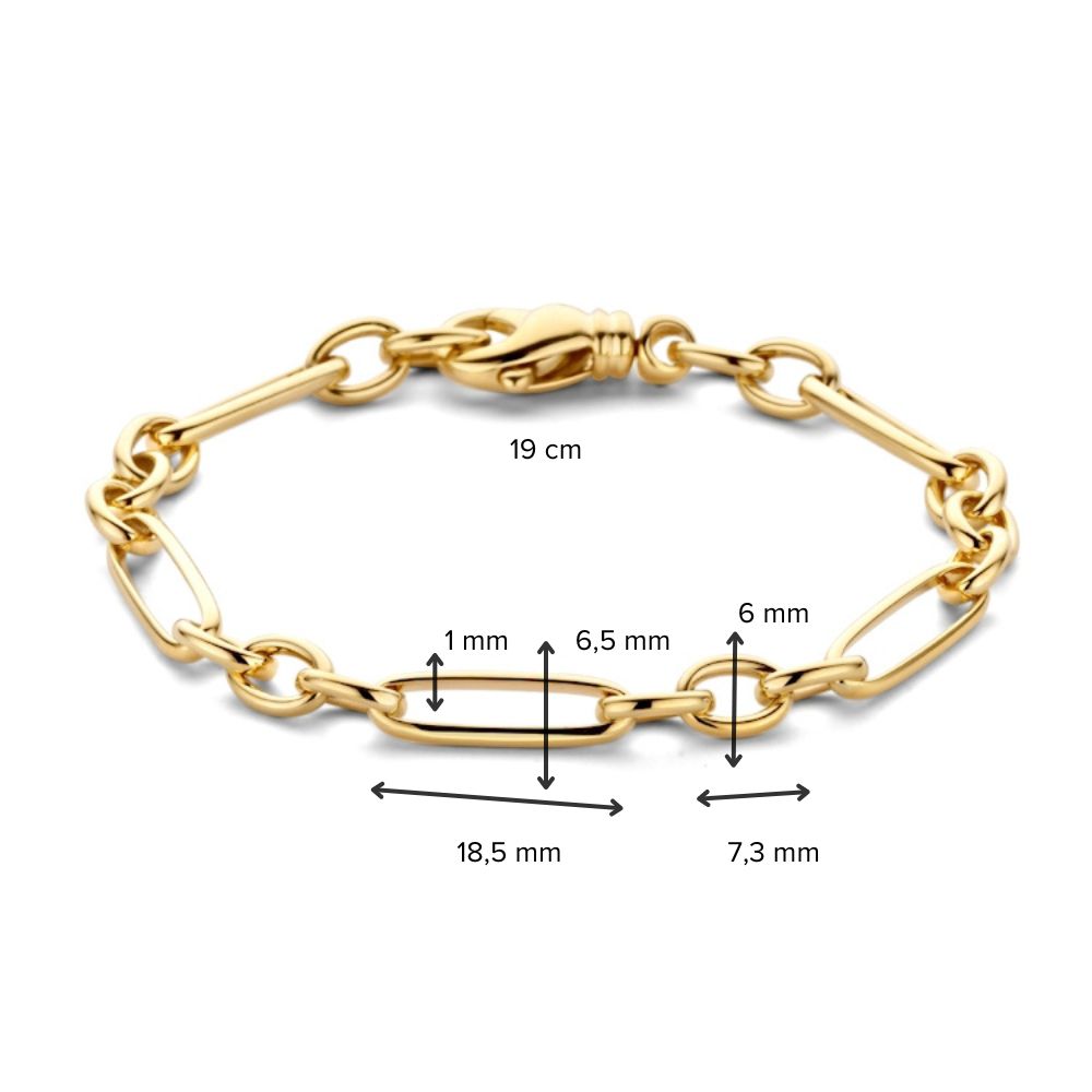 Geelgouden schakelarmband met wisselende schakel en luxe karabijnsluiting.