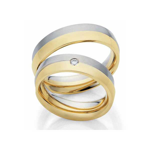 Bi-Color trouwringen wit – geelgoud, in damesring een diamant van 0.05ct briljantslijpsel.