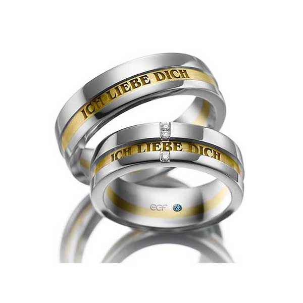 Witgouden trouwringen met verdiepte geelgouden baan met tekst naar keuze. In damesring 3 diamanten van 0,01 ct in briljantslijpsel.