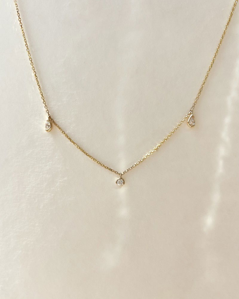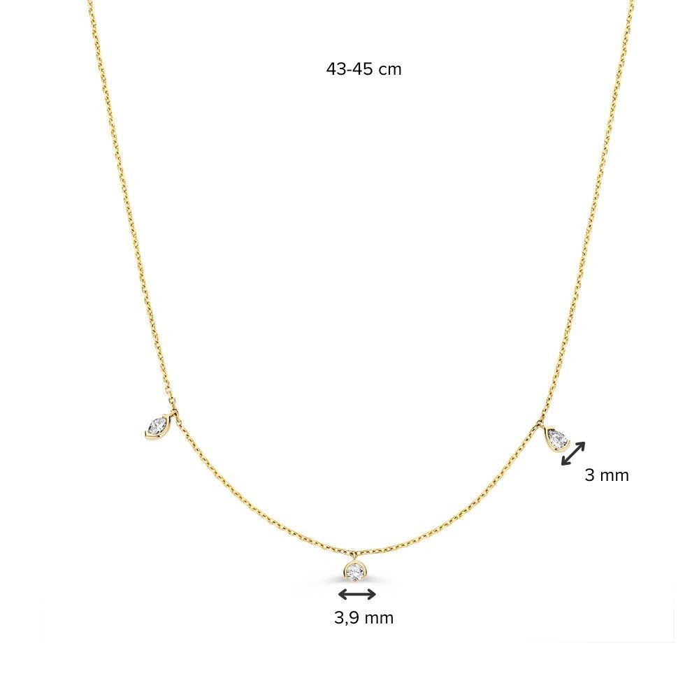 Verfijnd en speels collier met drie diamanten in open bezel zetting, de diamanten hebben ieder een eigen slijpvorm: briljant, markies en peer.