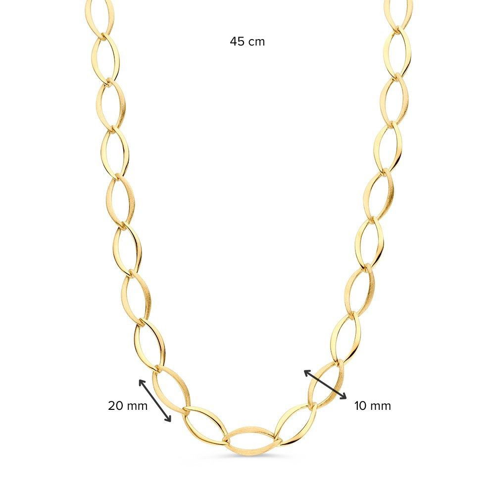 Speels, geelgouden schakelcollier waarbij de schakels om en om een gepolijste en een gematteerde afwerking hebben.