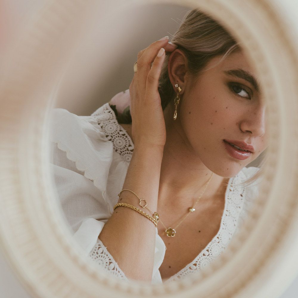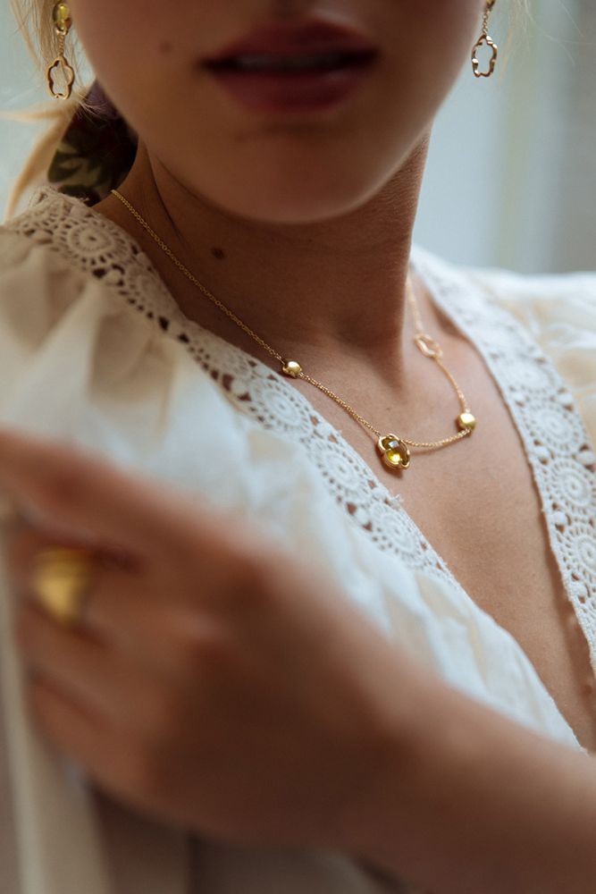 Geelgouden collier met edelstenen en gouden elementen in bloemvorm.
