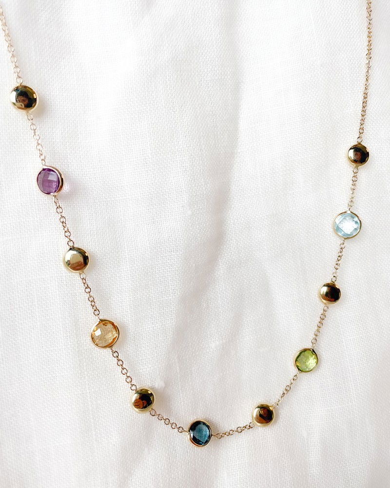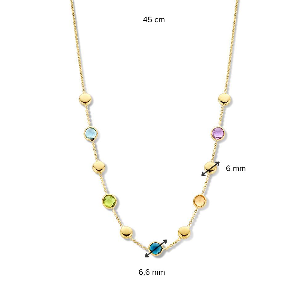 Geelgouden collier met verschillende kleurstenen en geelgouden elementen.