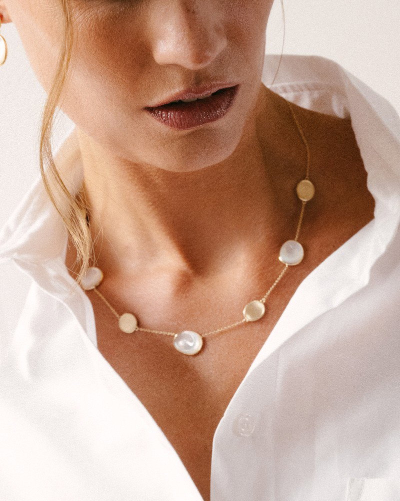 Geelgouden collier met prachtige matgouden en parelmoer elementen in organische vorm.