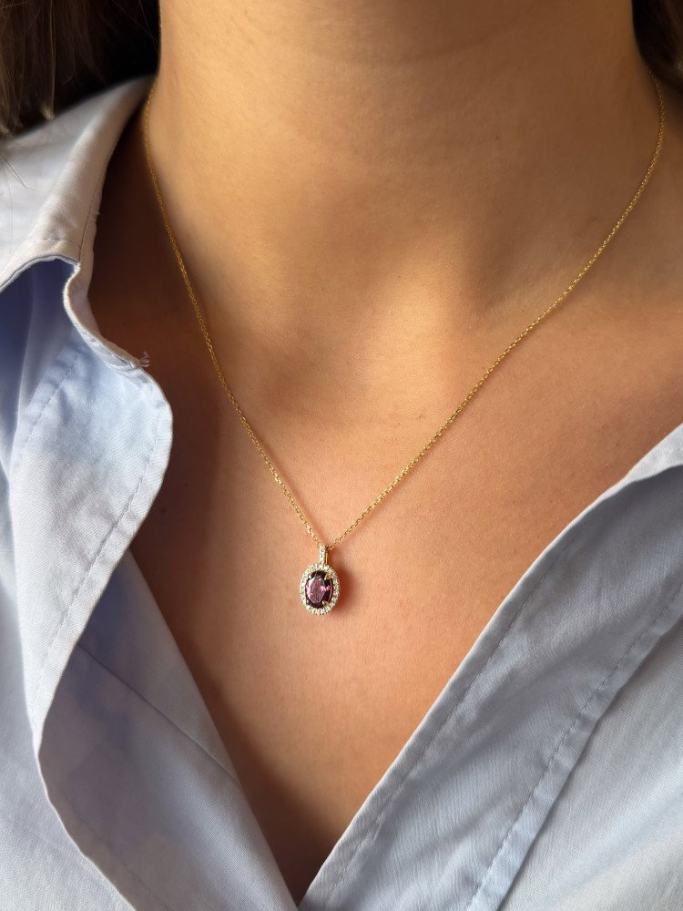 Elegante, geelgouden hanger gezet met een bijzondere, roze toermalijn edelsteen als eyecatcher. Deze betoverende edelsteen is gefacetteerd geslepen en dankzij de entourage zetting met fijne briljanten, schittert de ketting je tegemoet. De hanger wordt geleverd met een bijpassend 14kt geelgouden collier met ankerschakel en karabijnsluiting. Deze collectie bestaat uit sieraden met verschillende edelstenen, je kiest zelf de kleur die het best bij jou past.