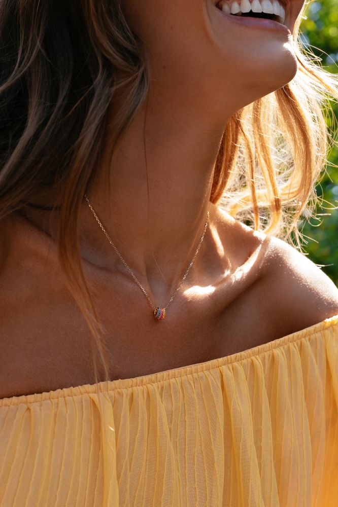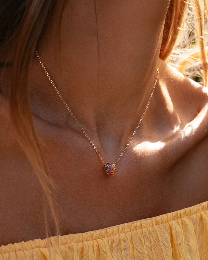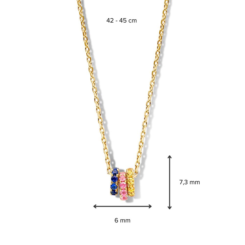 Speels collier met drie gouden hangers gezet met gekleurde saffier in kleurverloop.