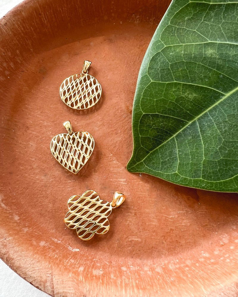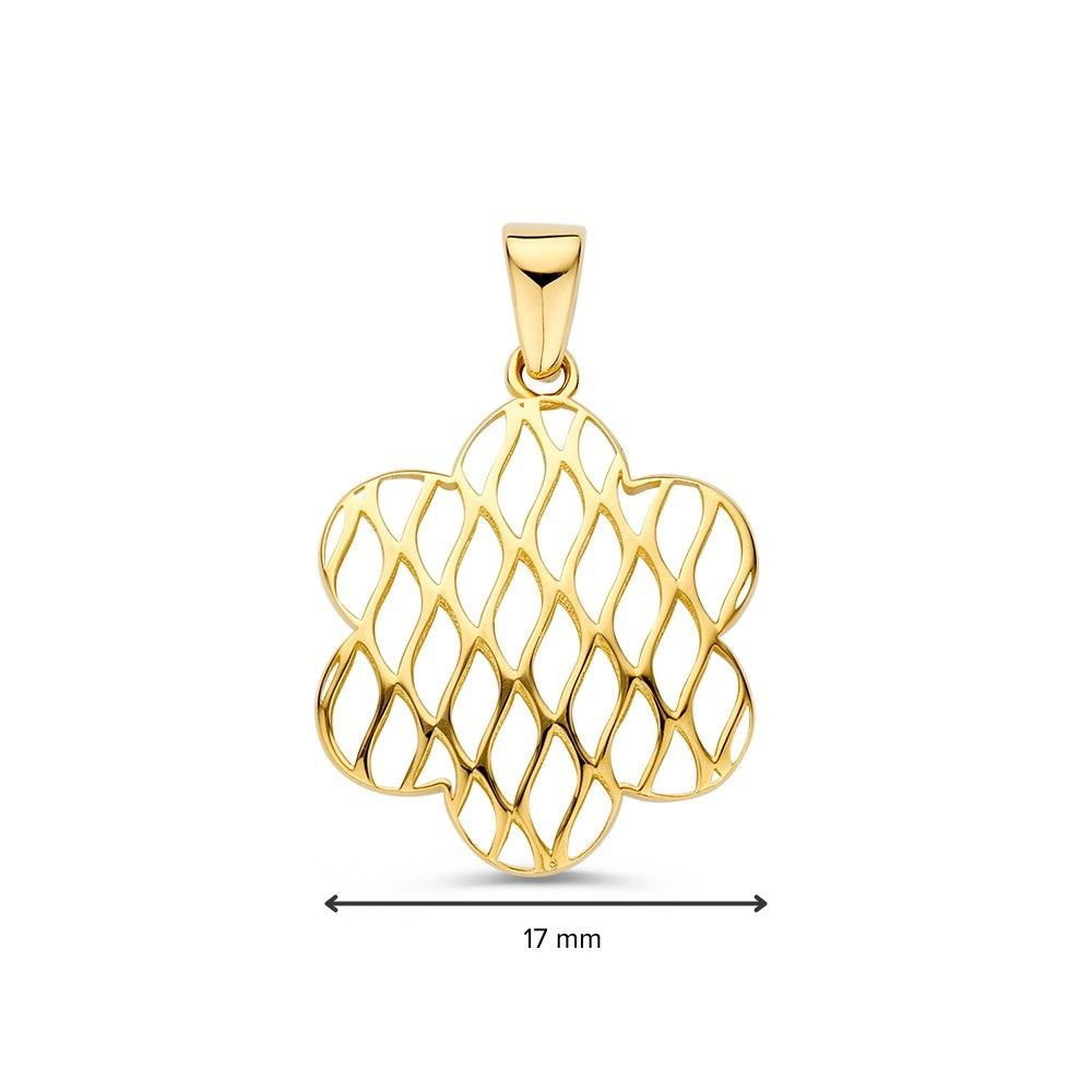 Opvallende, gouden hanger in bloemvorm met een opengewerkt raster.