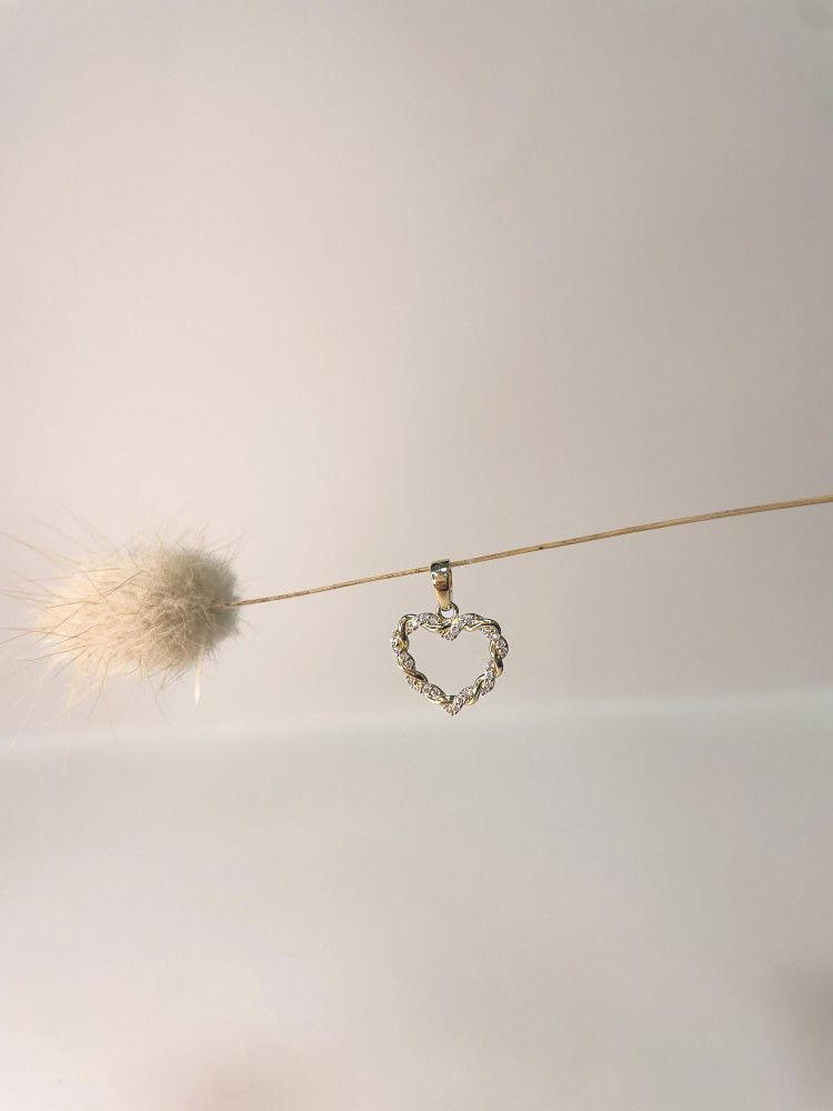 Geelgouden hanger in hartvorm met gedraaide band, gezet met fijne zirkonia’s.