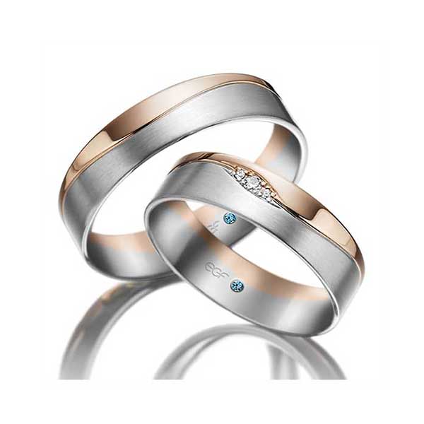 Mat gouden trouwringen van 5,5 mm breed in rood en witgoud met golfvoeg in het midden. Gezet met 3 diamanten, één van 0.02 ct en twee van 0.005 ct. Het roodgoud is gepolijst.