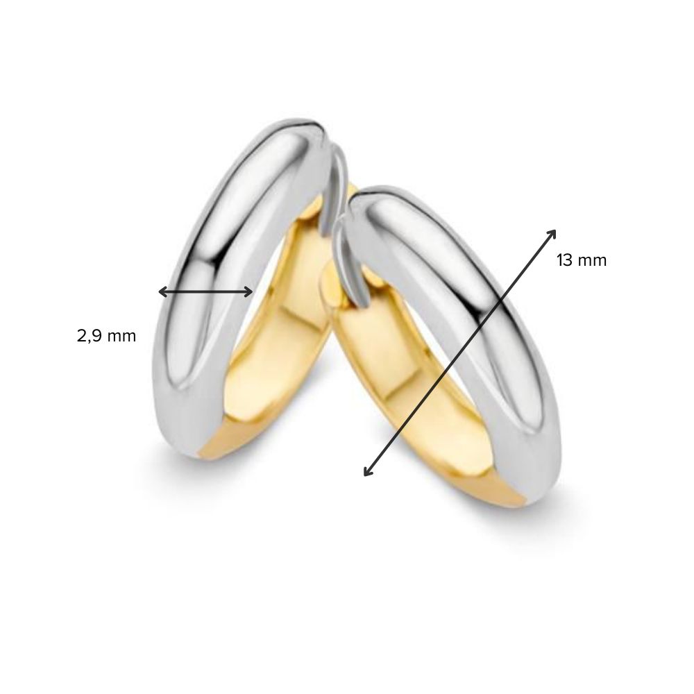 Bicolor wit- en geelgouden creolen. Deze oorbellen zijn aan beide zijdes te dragen.