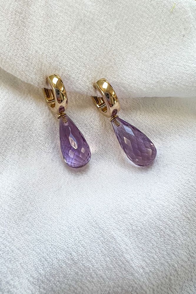 Geelgouden oorringen met hangers van paarse amethist. De druppelvormige edelstenen zijn gefacetteerd geslepen.
