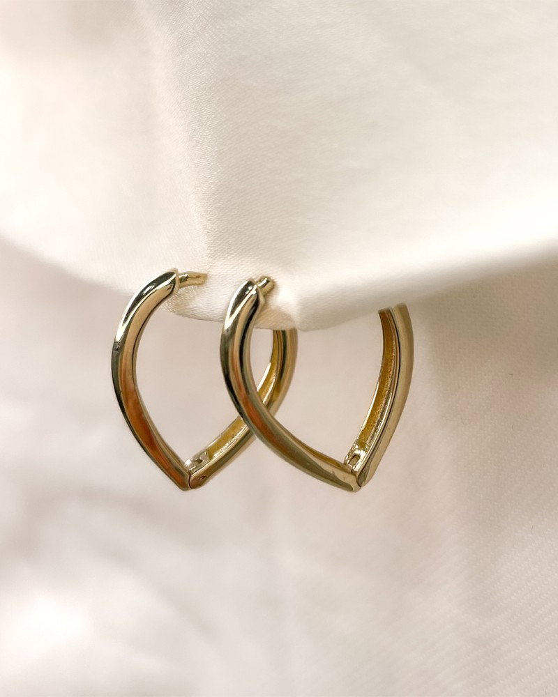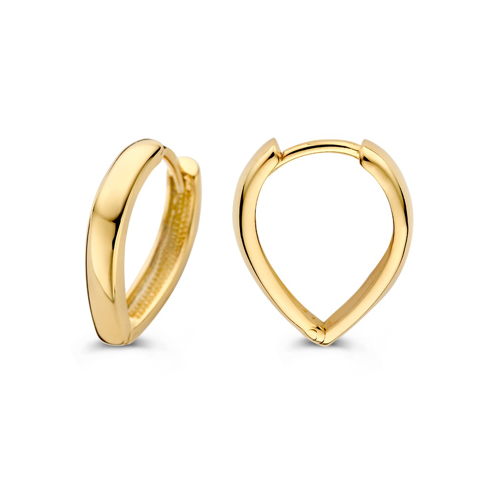 Geelgouden oorrringen die taps toelopen en daardoor een speelse uitstraling in het oor hebben.