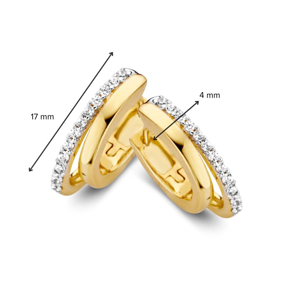 Gouden oorringen met twee asymmetrische banen, waarvan één gezet met zirkonia’s.