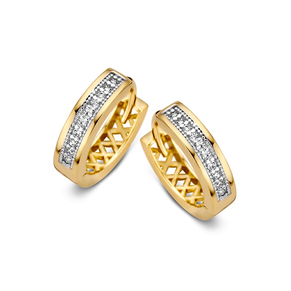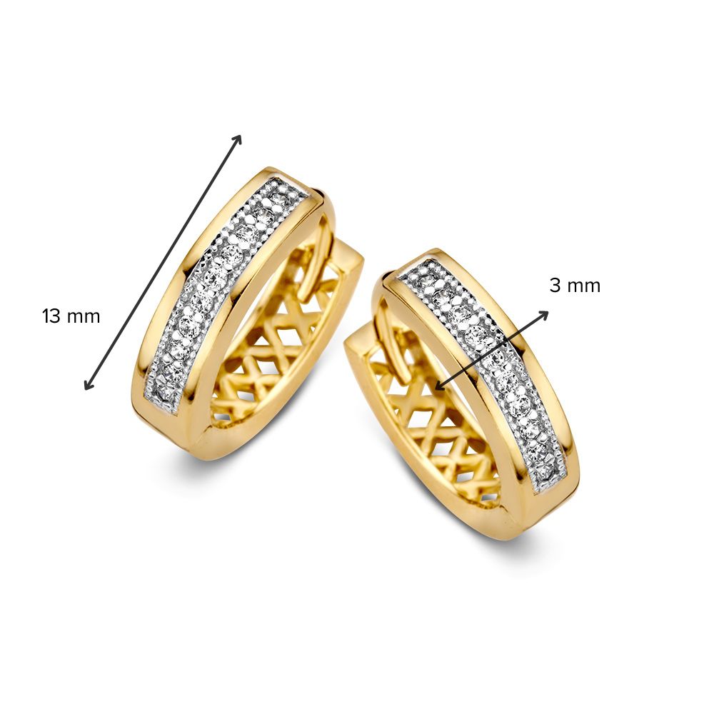 Geelgouden oorringen met zirkonia’s in strakke zetting.
