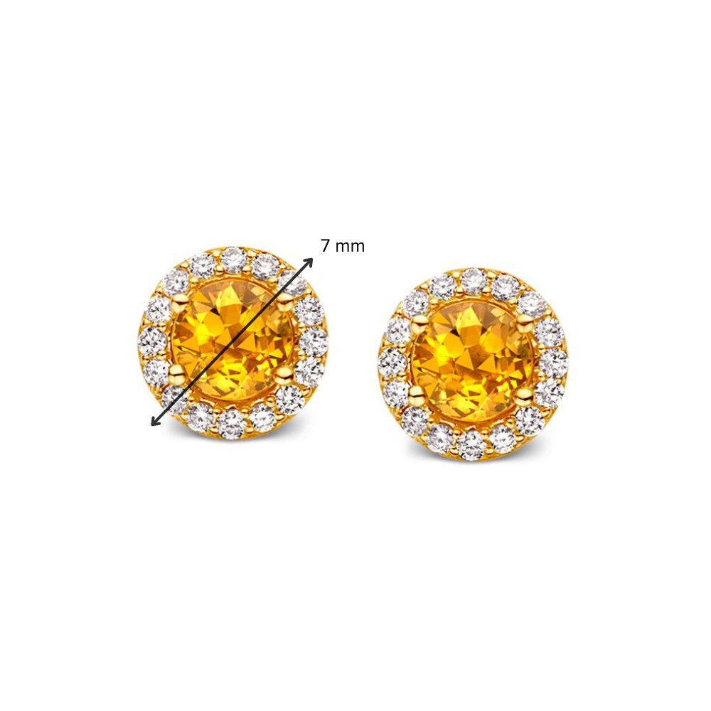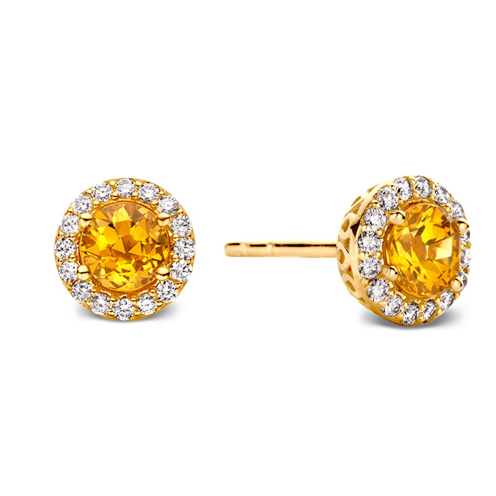 Schitterende roségouden oorstekers met warme oranje saffieren in entourage zetting met briljant.