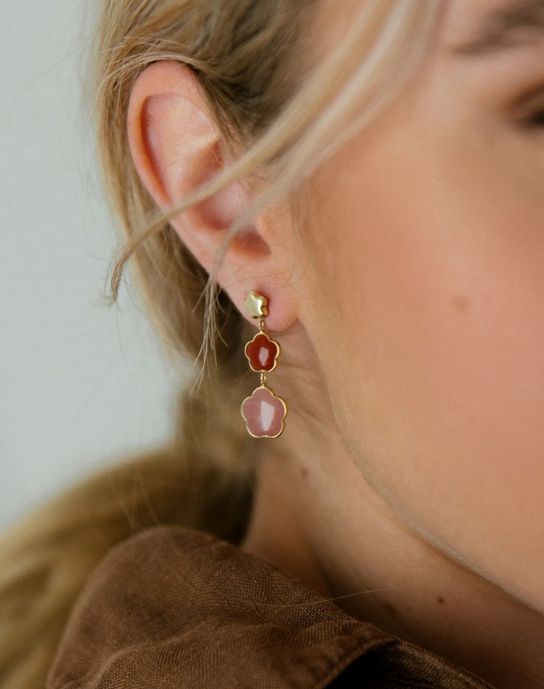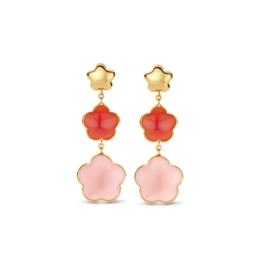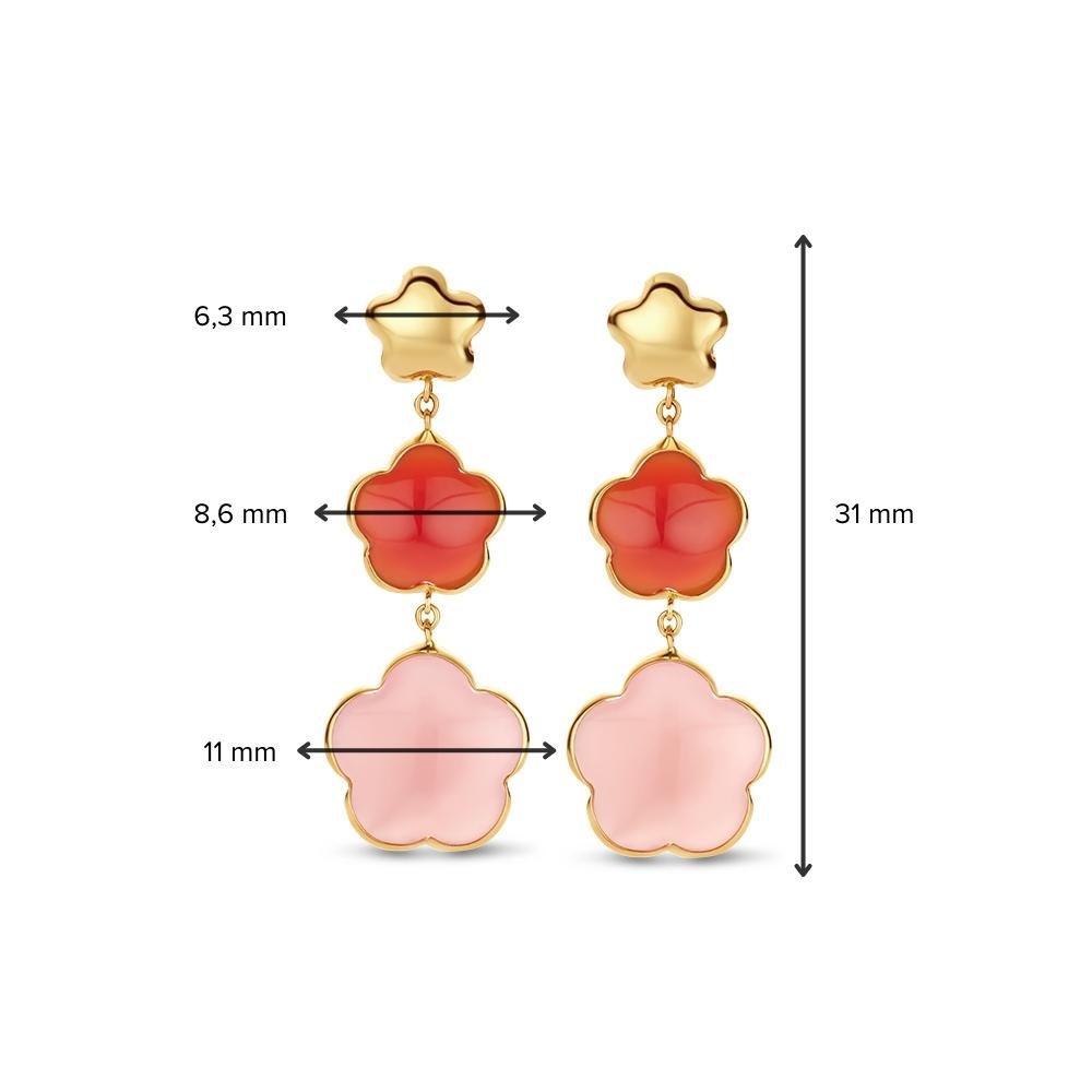 Geelgouden oorbellen met carneool en calcedoon in bloemvorm.