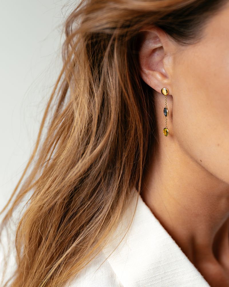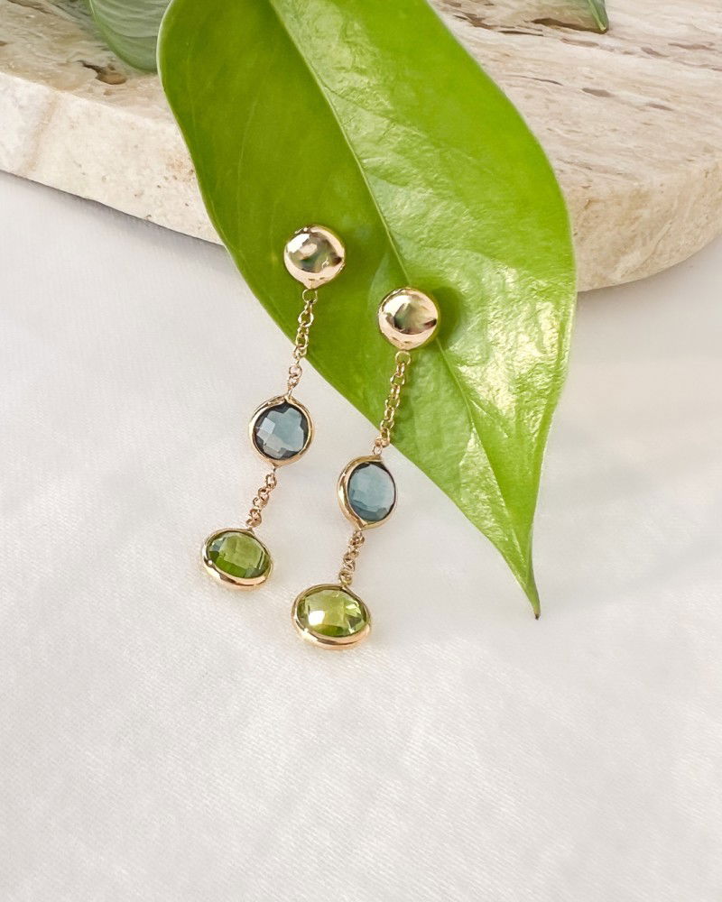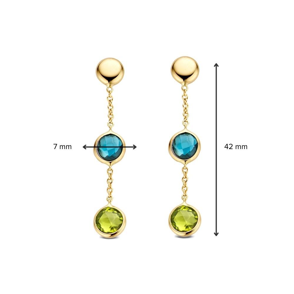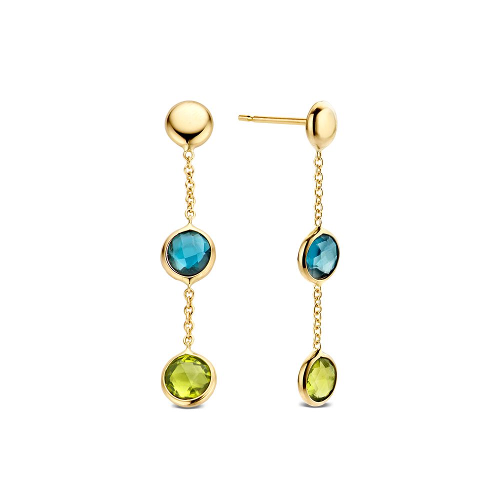 Geelgouden oorbellen met stijlvolle hangers gezet met topaas en peridot.