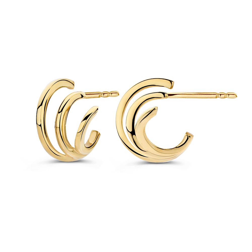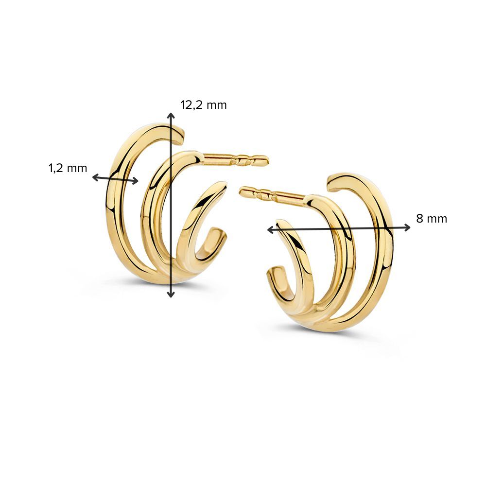 Geelgouden oorstekers. Wanneer de oorbellen in het oor zitten, lijken ze uit drie verschillende ringen te bestaan.