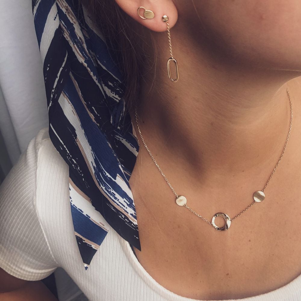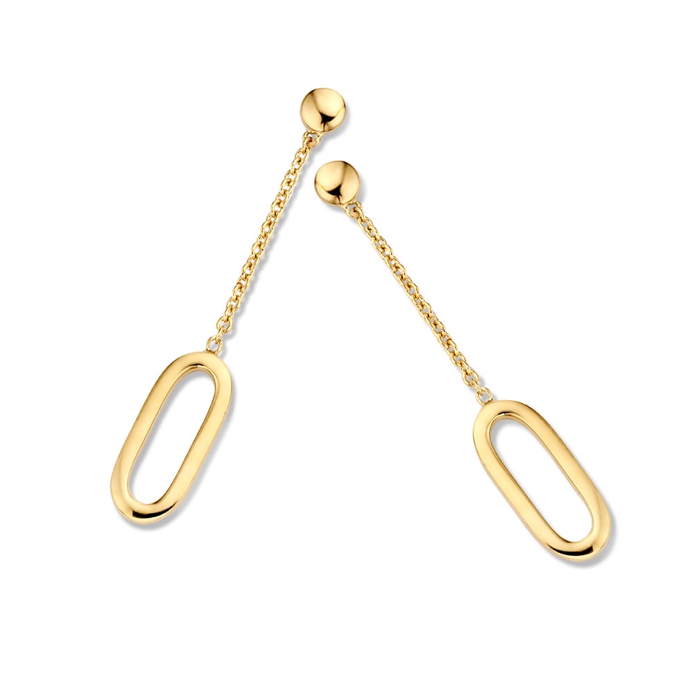 Geelgouden oorstekers met lange aanhangers met gouden elementje.