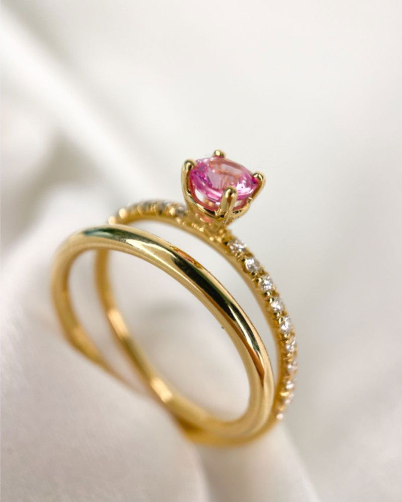 Een prachtige 18kt geelgouden ring met uniek design. De banen van deze ring lopen a-symmetrisch langs elkaar heen, waarbij een van de gouden banen gezet is met fonkelende diamanten. Daarnaast bevat de ring een bijzondere, roze saffier als stralend middelpunt.