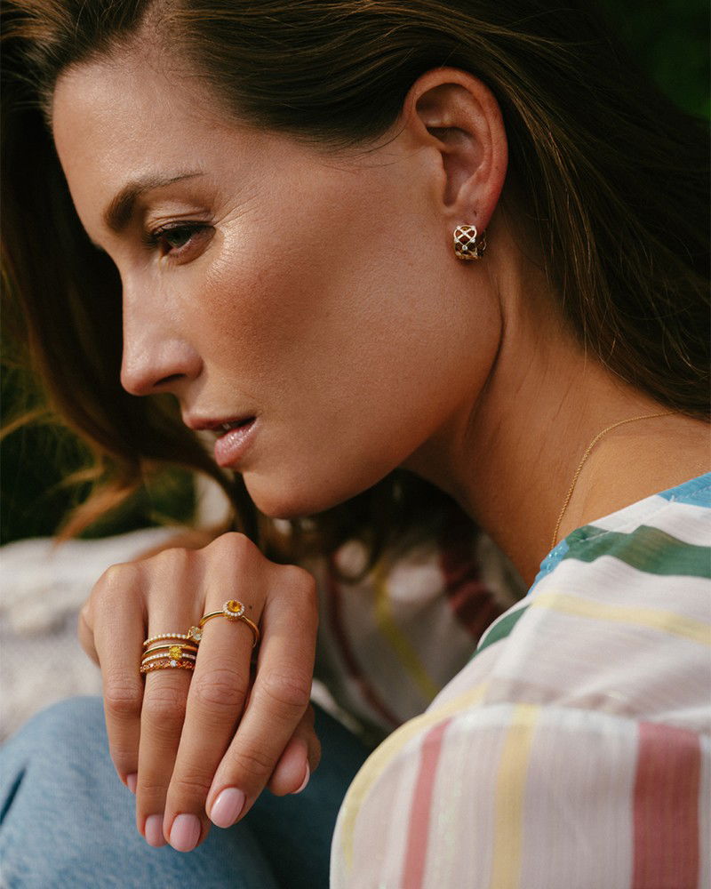 Een prachtige rosegouden ring met uniek design. De banen van deze ring lopen a-symmetrisch langs elkaar heen, waarbij een van de gouden banen gezet is met fonkelende diamanten. Daarnaast bevat de ring een beeldschone groene saffier als stralend middelpunt.