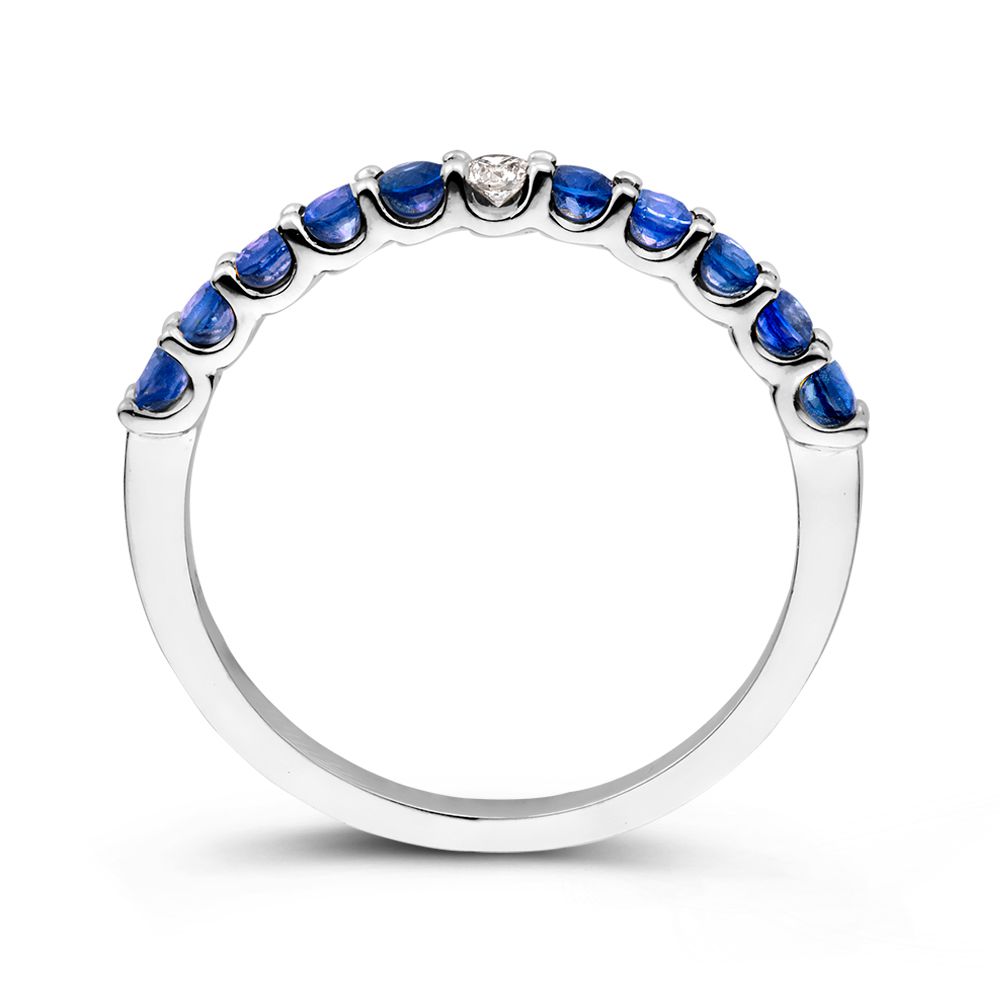 Stijlvolle witgouden rijring met tien blauwe saffieren en een witte briljant als stralend middelpunt.