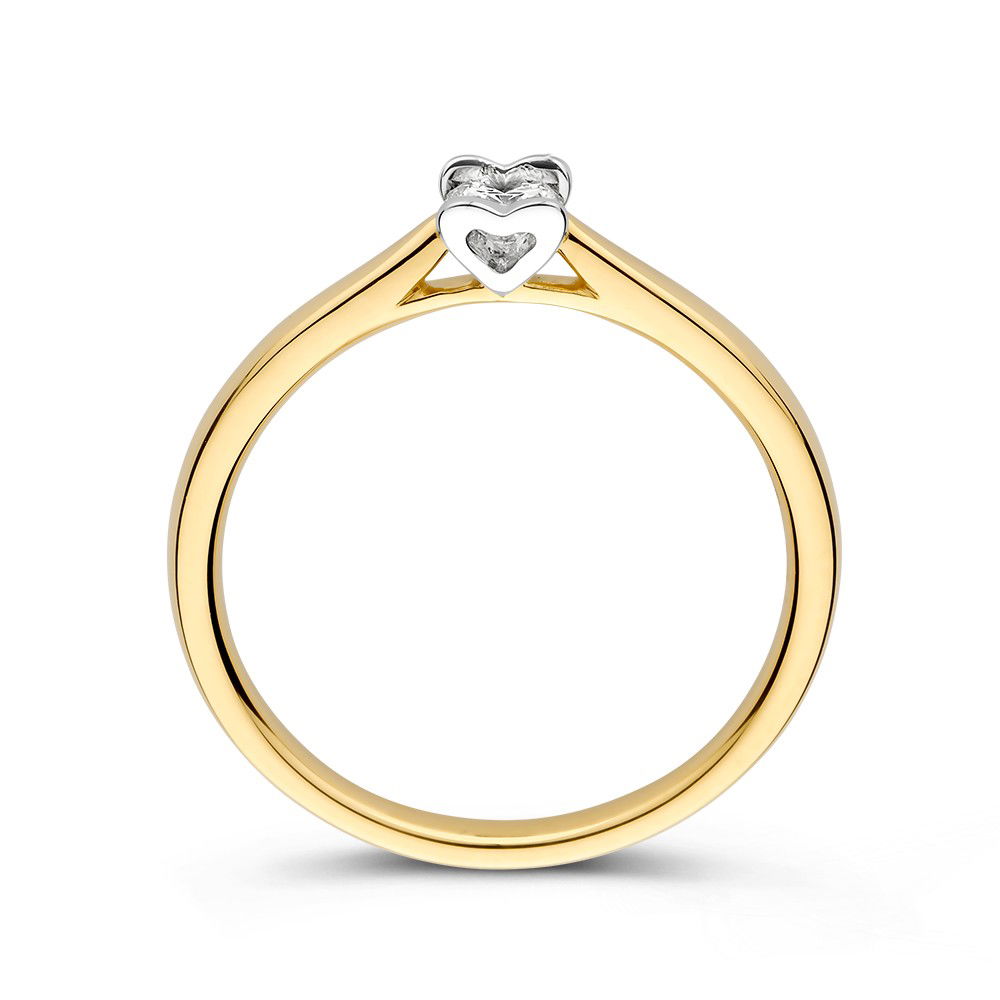 Bicolor wit- en geelgouden solitair ring met een diamant een bijzondere hartvormige zetting.