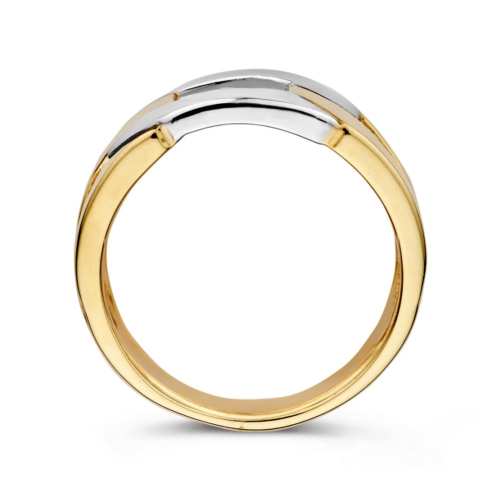 Brede statement ring in bicolor wit- en geelgouden uitvoering. De strakke, vlakke schakel geven deze ring een unieke uitstraling.