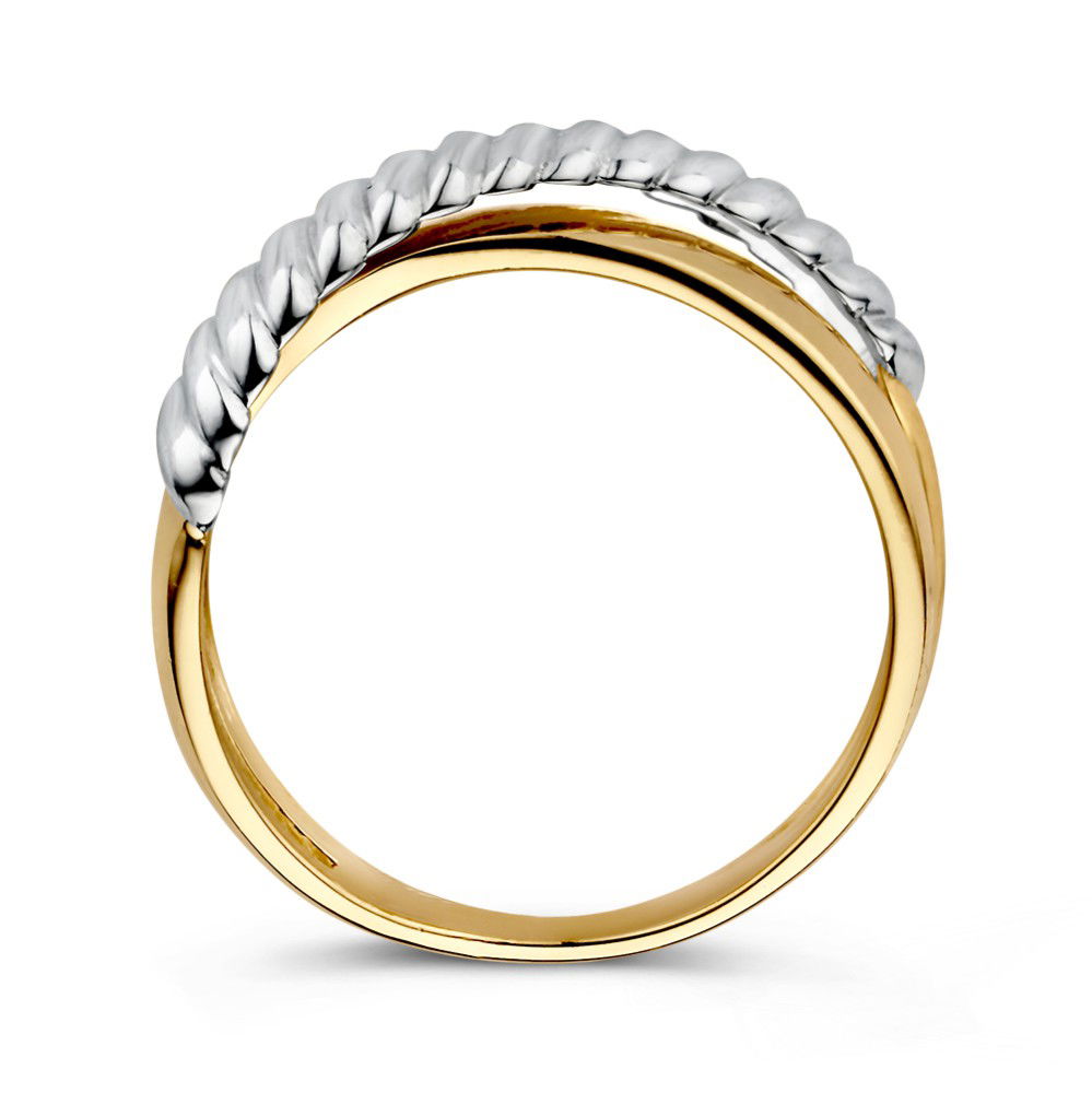 Bicolor wit- en geelgouden crossover ring. De witgouden baan heeft een geribbeld design, waardoor de ring een speelse uistraling heeft.