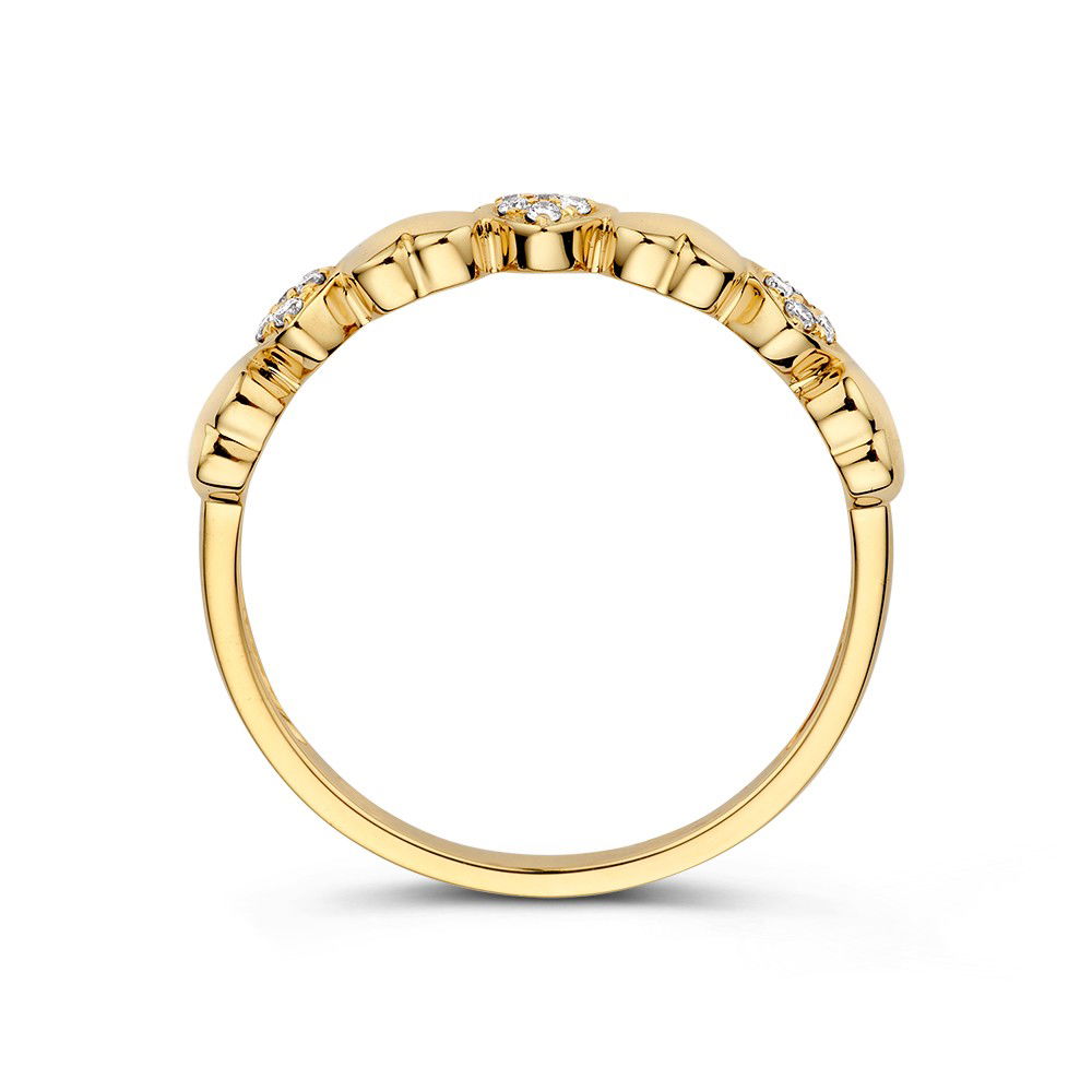 Prachtige geelgouden ring met hartjes, waarvan drie hartjes ingelegd met diamanten. Leuk om zo te dragen, maar ook perfect om met andere ringen te combineren.