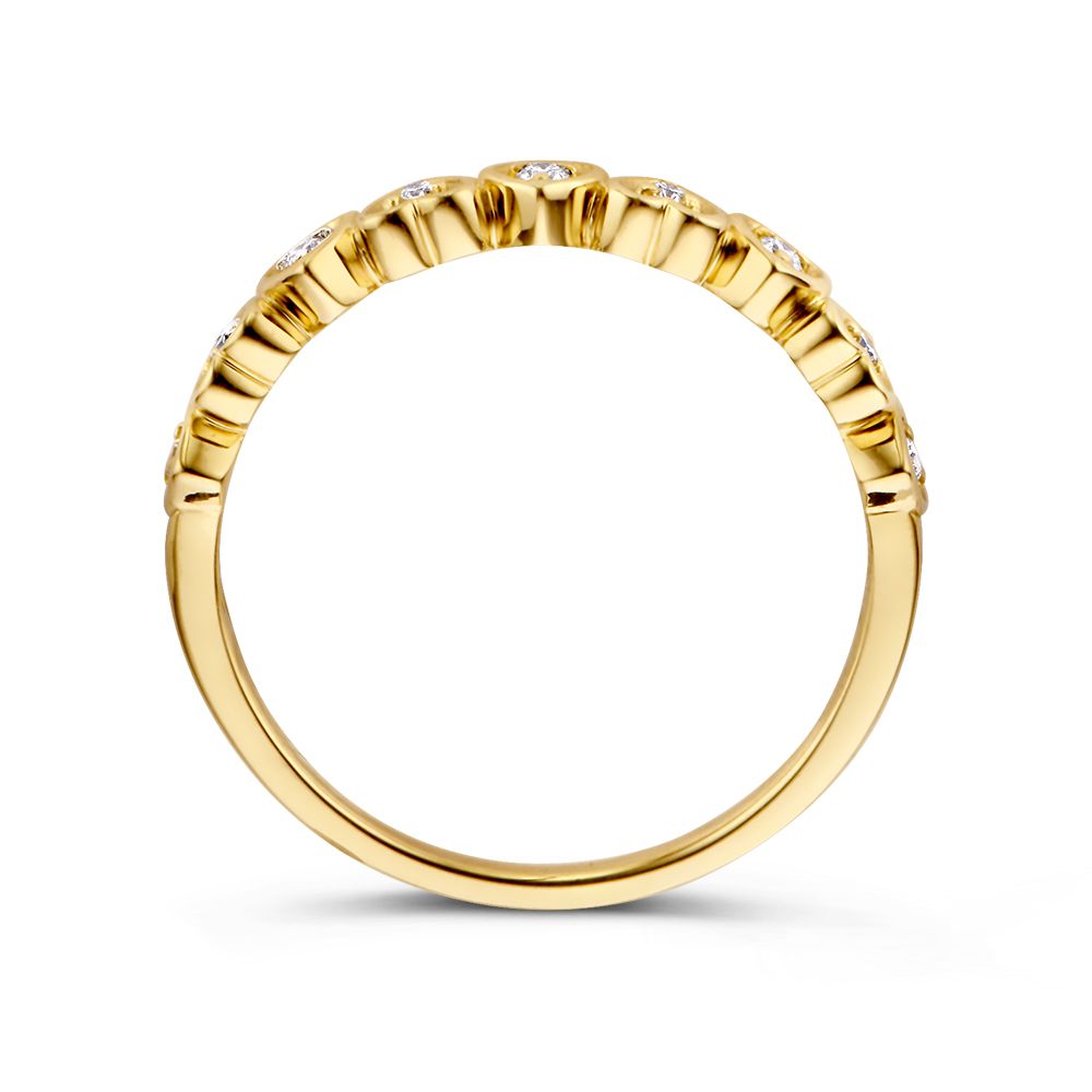 Verfijnde geelgouden bandring voorzien van hartjes met fijne diamanten. Geschikt om te combineren met andere ringen.