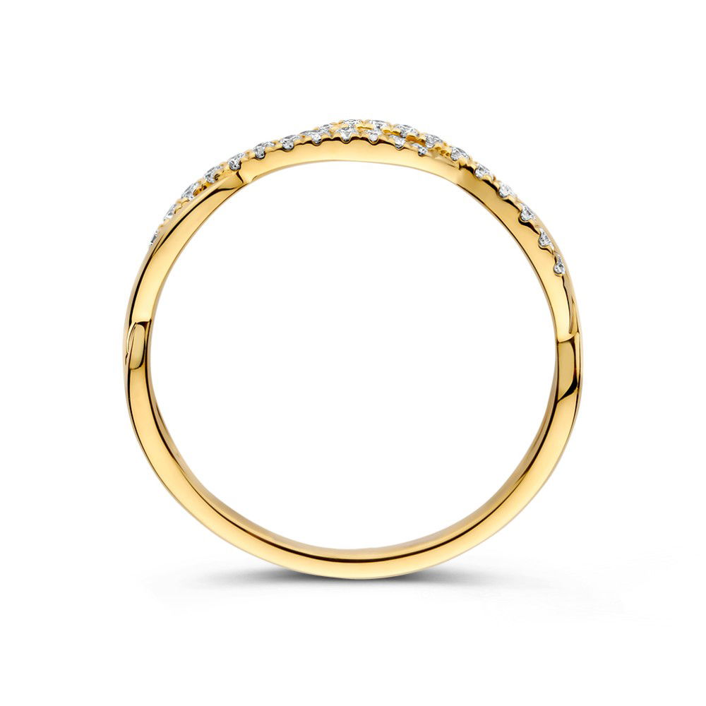 Geelgouden ring met een twist gezet met diamant. Leuk om te combineren met andere ringen.
