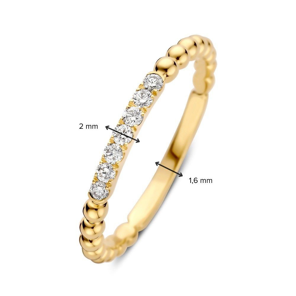Verfijnde geelgouden bolletjesring met een diamanten tussenstuk. Mooi om zo te dragen, maar ook prachtig in jouw eigen ringstack te combineren.
