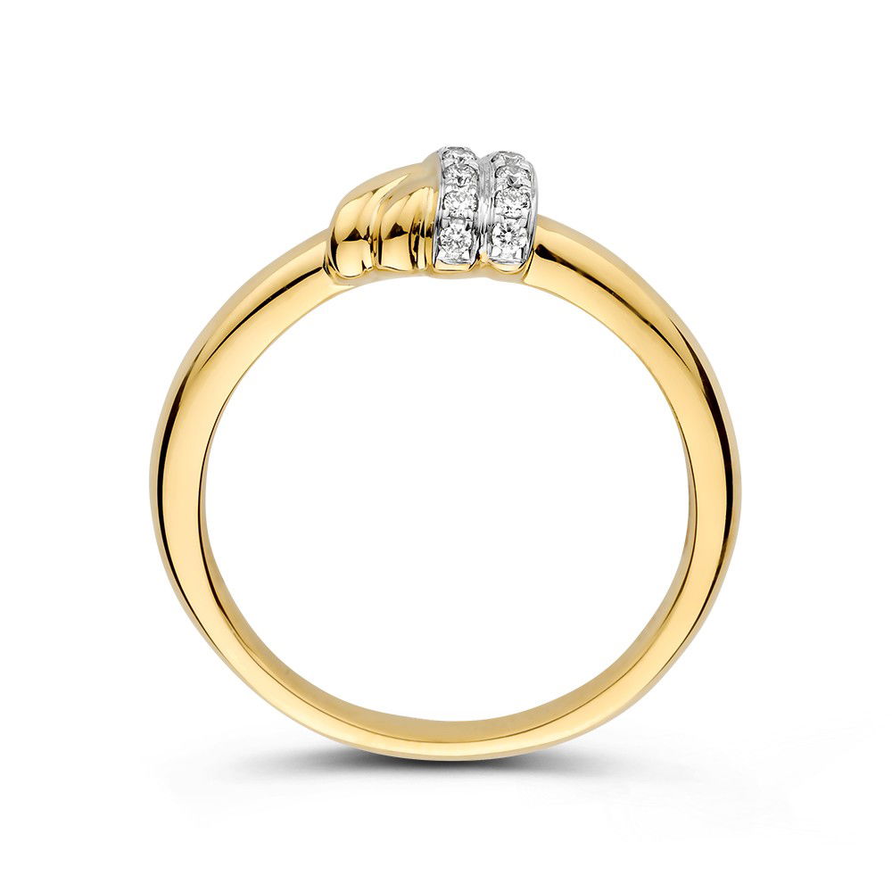 Speelse geelgouden ring met bovenop een knoop in wit- en geelgoud. Het witgouden gedeelte is gezet met fijne diamanten.
