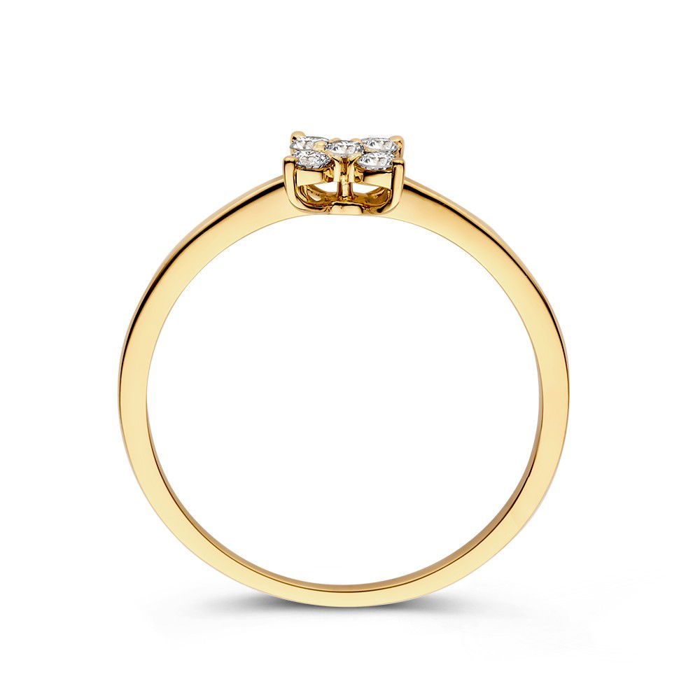 Elegante geelgouden ring met diamanten gezet in bloemvorm. Deze ring is dankzij de verhoogde zetting goed met andere ringen te combineren.