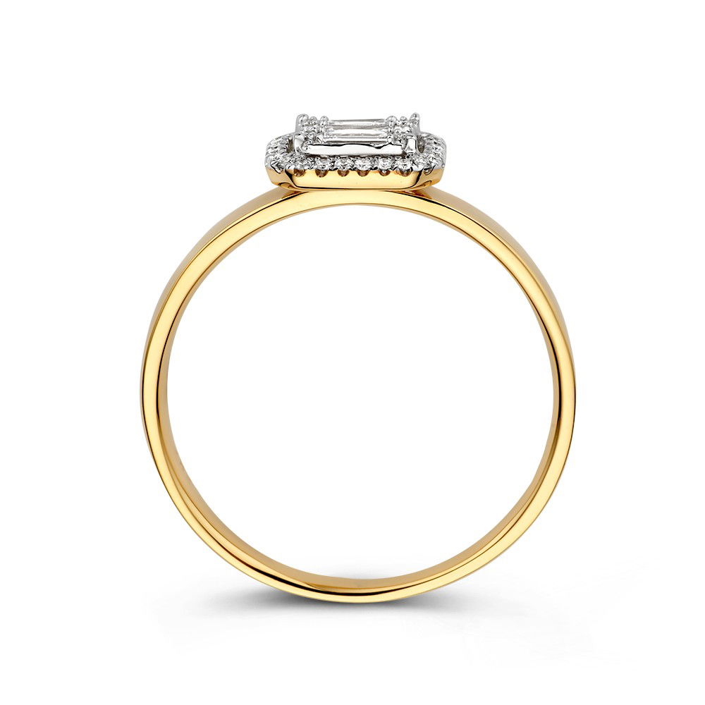 Schitterende wit- en geelgouden ring met een strakke scheen. De entourage zettingen bevat briljant en baguette geslepen diamanten in een prachtige invisible zetting. Deze ring is dankzij de verhoogde zetting goed te combineren met andere ringen.