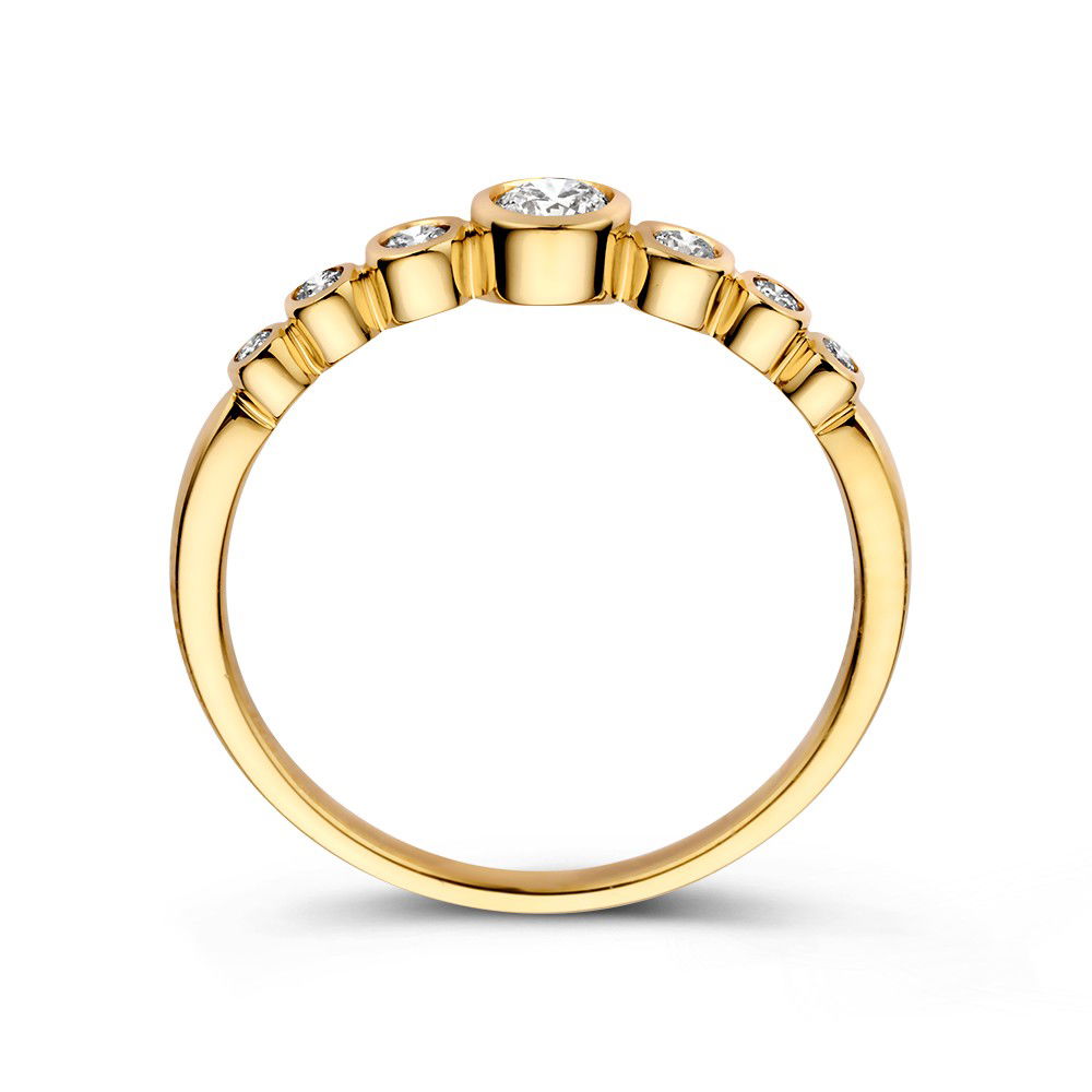Elegante, gouden ring uit onze ‘Bubbles’-collectie, de ring is versierd met verschillende diamanten in stijlvolle gouden zetkastjes, speels variërend in grootte.