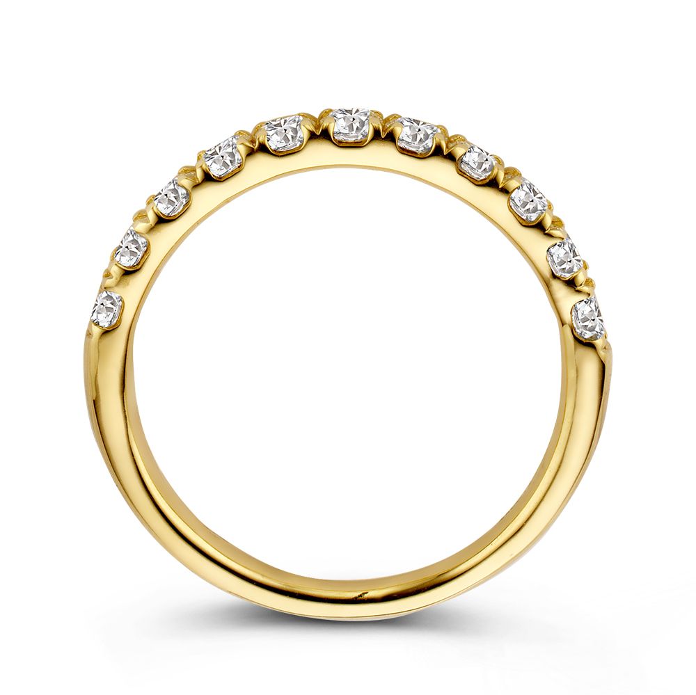 Geelgouden rijring met 11 diamanten, halfom gezet. Dankzij de bolle scheen heeft de ring een hoog draagcomfort.