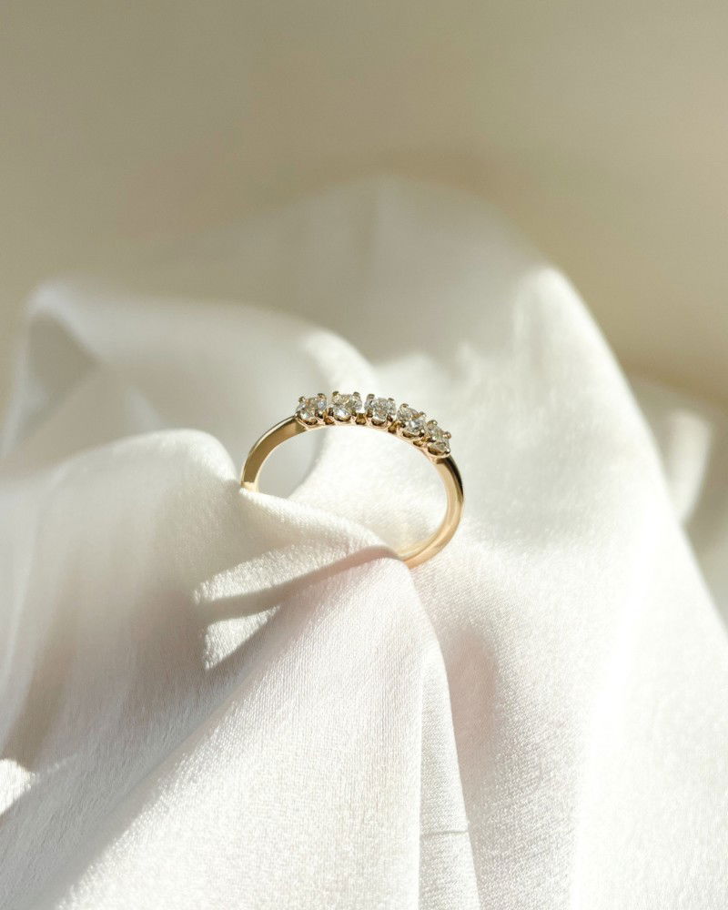 Geelgouden alliance ring met vijf diamanten (0,10 crt. per diamant). Prachtig om zo te dragen of te combineren met andere ringen.