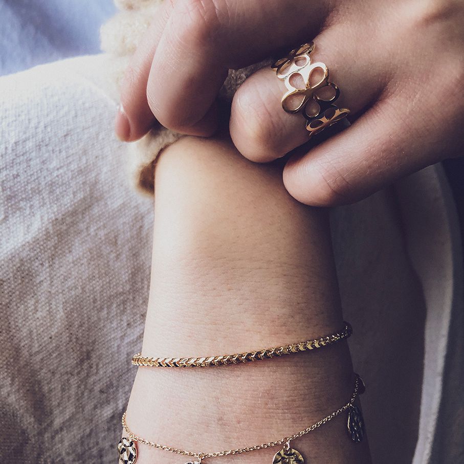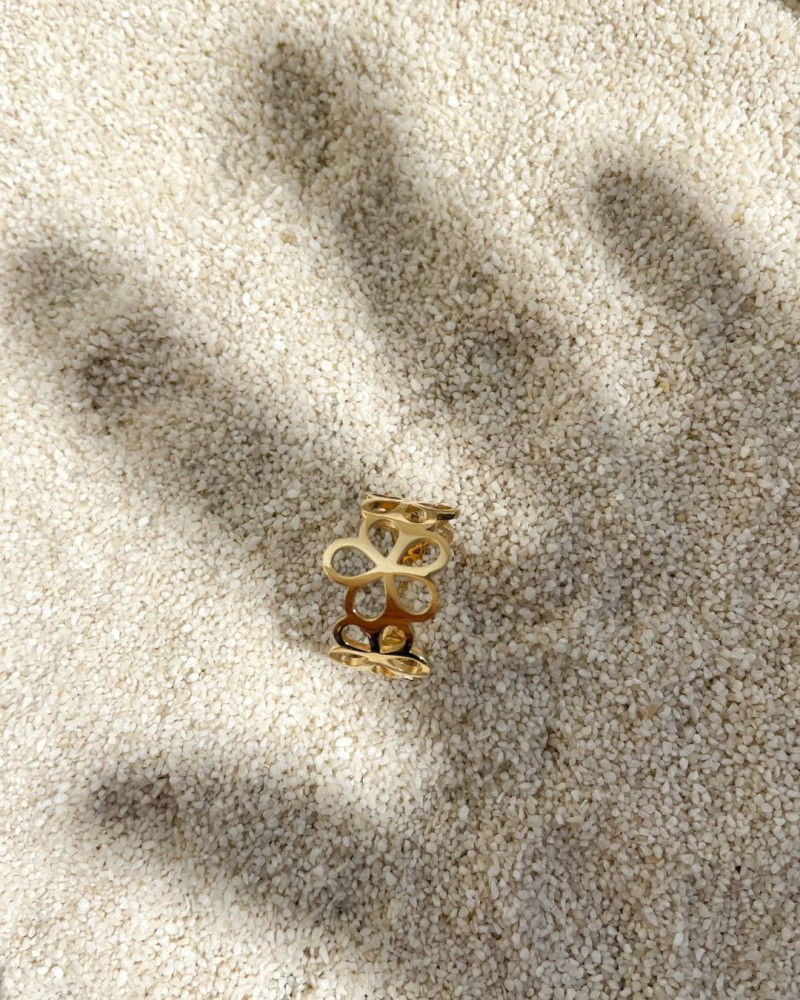 Geelgouden ring met opengewerkt bloemenpatroon.