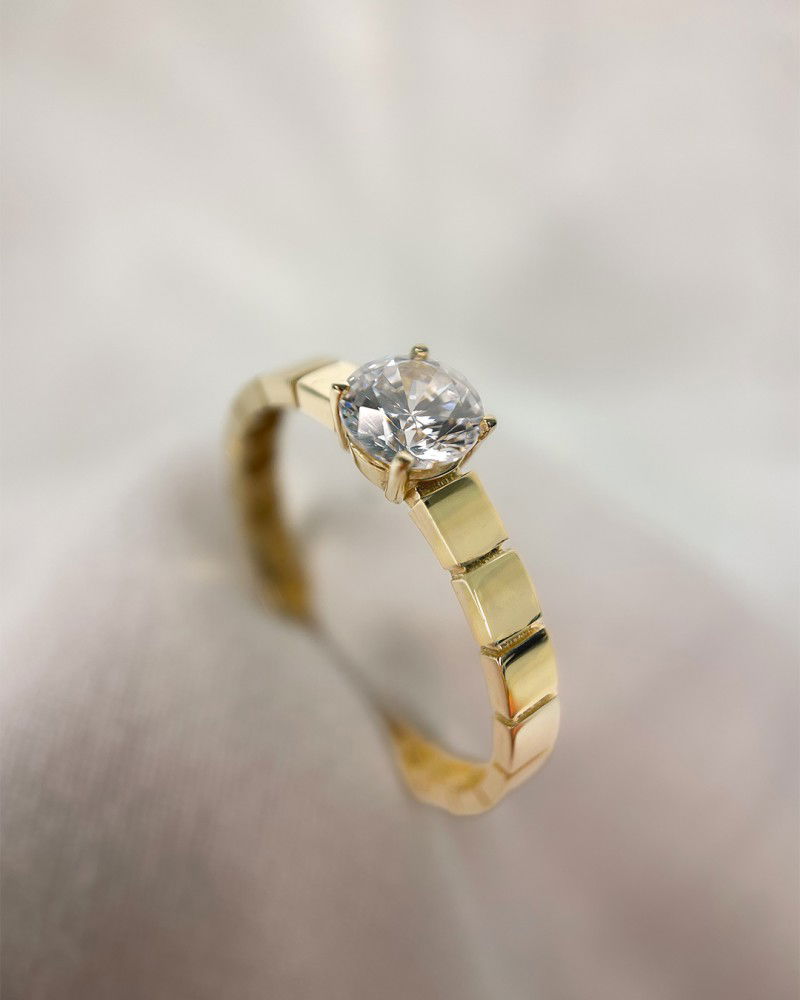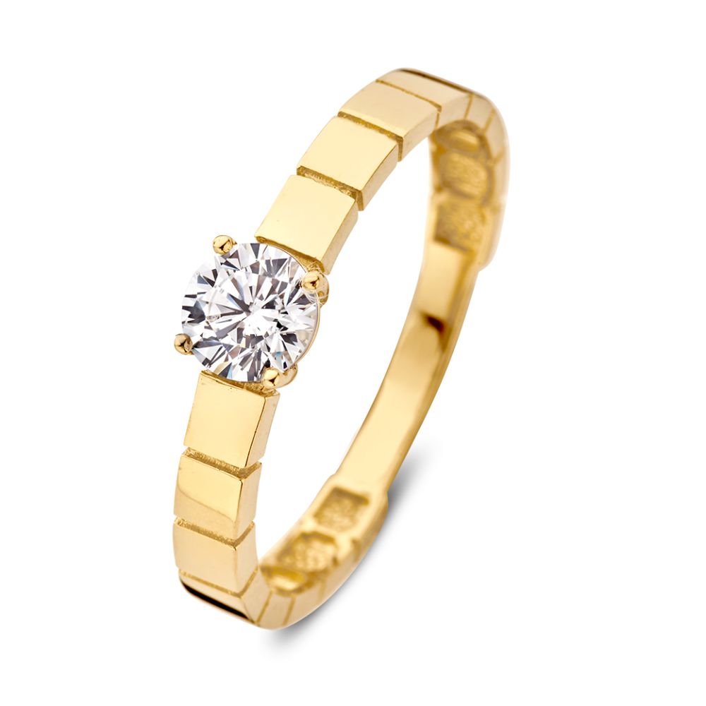 Geelgouden ring met bewerkte band en zirkonia middensteen.
