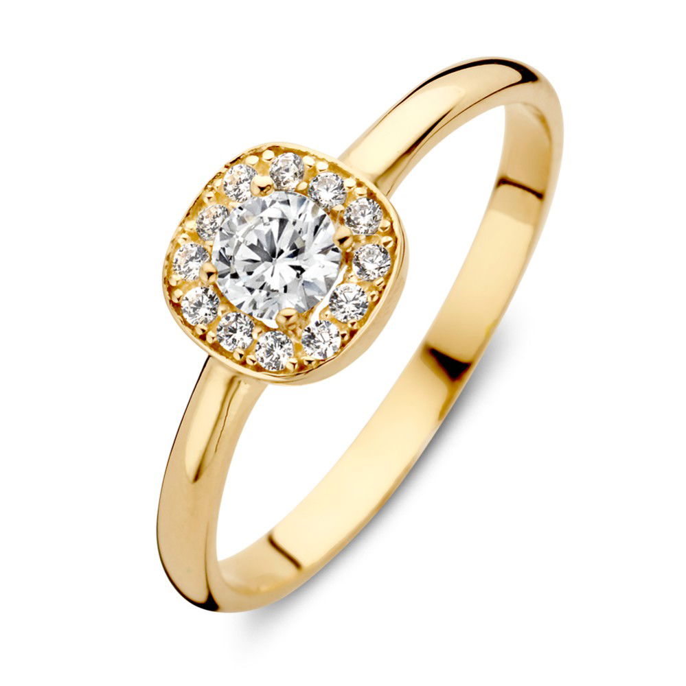Geelgouden ring met een ronde zirkonia in vierkante zetkast. De middensteen heeft een halo van fijnere zirkonia’s.