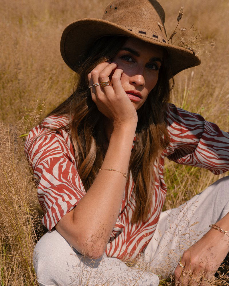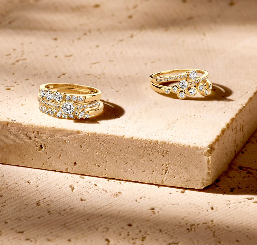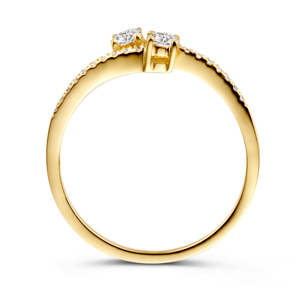 Geelgouden ring met speels design van een dubbele band met zirkonia’s.