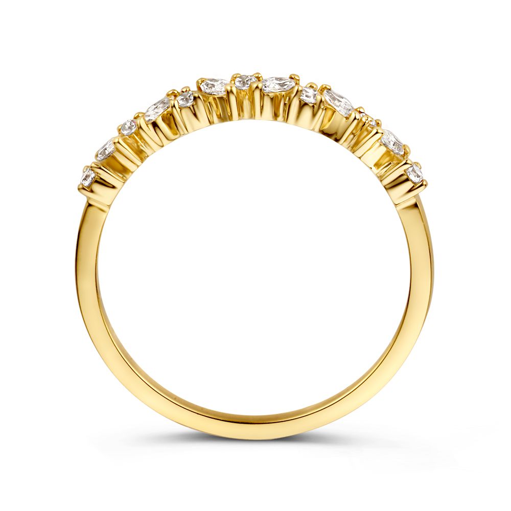 Geelgouden ring vol zirkonia’s met opvallende fancy cut slijpsels (halfom gezet).