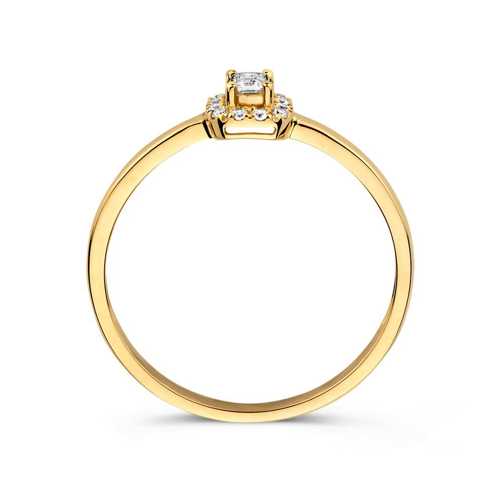 Elegante, geelgouden ring met entouragezetting en een emerald geslepen zirkonia.